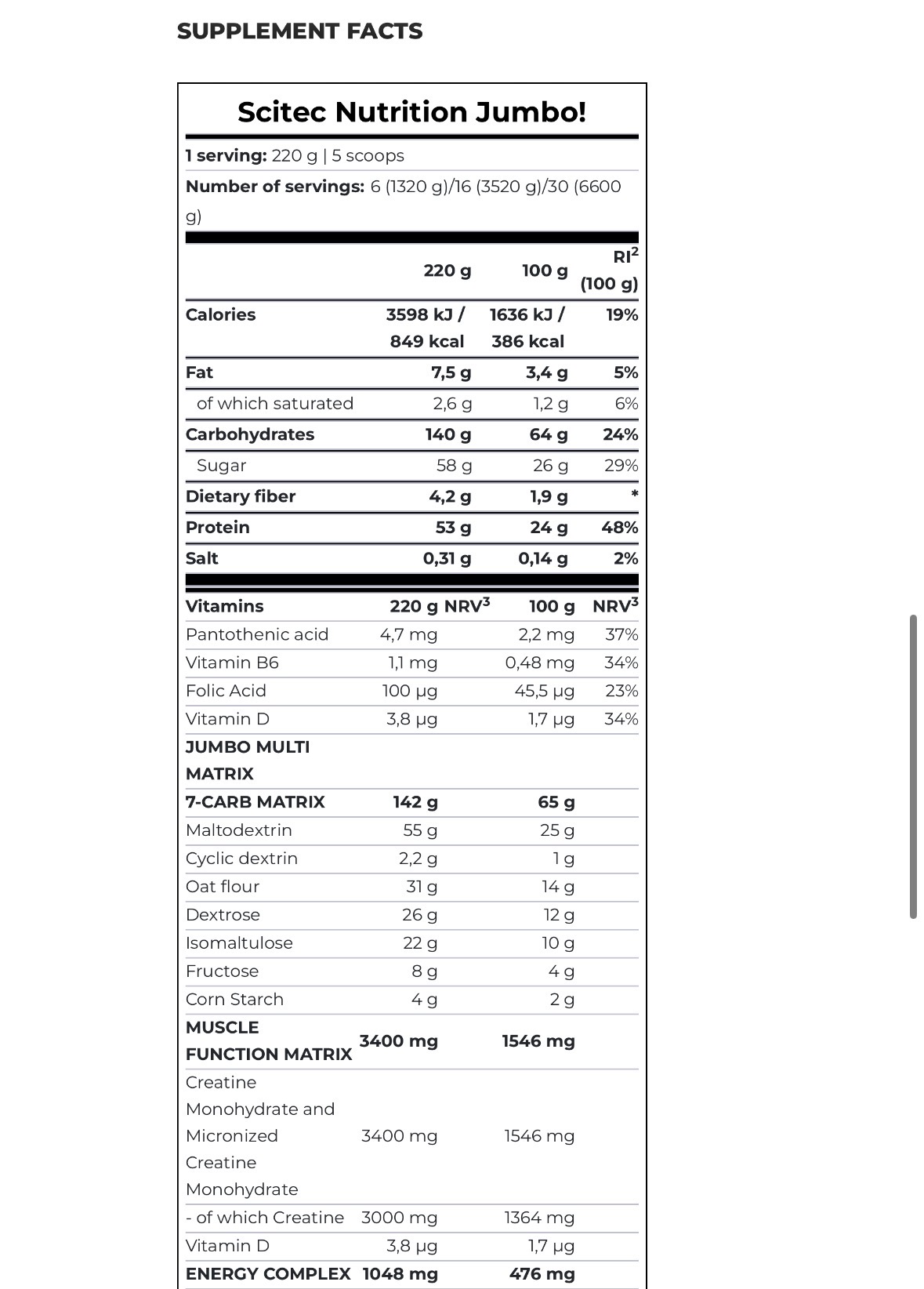 Jumbo, true to its name, helps those looking to bulk up to achieve that calorie surplus more easily with its large portions. It contains 53 grams of protein and 140 grams of carbohydrates per serving, fortified with 3 grams of creatine*, amino acids, vitamins and plant extracts.